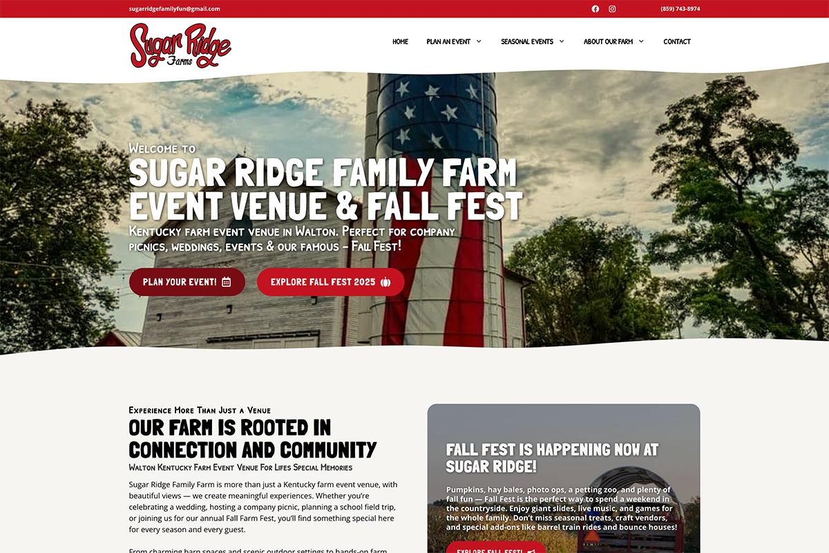Full WordPress build for a Kentucky farm event venue — multi-page site architecture covering seasonal events, private event bookings, weddings, and corporate picnics.